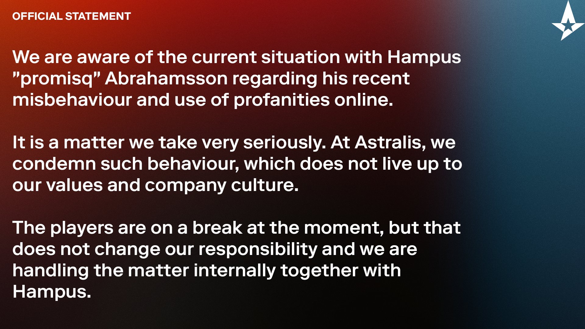 Astralis has released a statement condemning the behaviour of veteran support Hampus promisq Abrahamsson after members of the League of Legends community posted screenshots of toxic in-game messages from the Swede. Photo via Riot Games. All the best to you in the future in English.